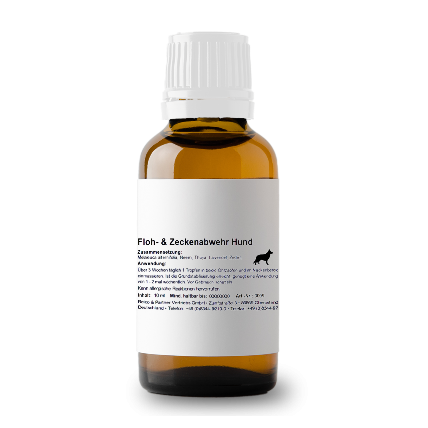 Vor dem Spaziergang sprüht man den Hund am Bauch und an den Beinen leicht ein. Die Mischung aus ätherischen Ölen hält Zecken und Flöhe fern. Eine gute Ergänzung, wenn der Hund noch keine Grundstabilisierung durch „Floh- und Zeckenabwehr Hund“ hat.