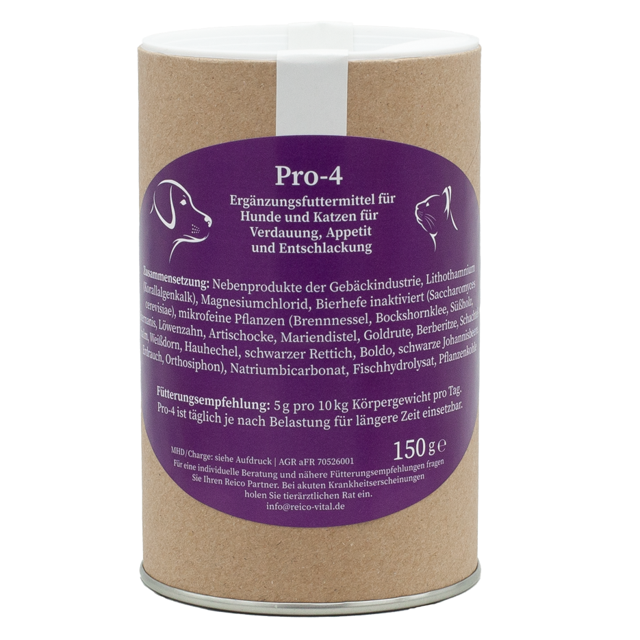Pro-4 ist eine Mischung aus Kräutern, Vitaminen der B-Gruppe und Aminosäuren, die speziell zum Schutz der inneren Organe entwickelt wurde, wie z. B. Leber, Bauchspeicheldrüse, Niere, Galle u.a. Es kann Darmprobleme verhindern und fördert eine blähungsfreie Verdauung. Zudem unterstützt Pro-4 das Tier im Darmaufbau.